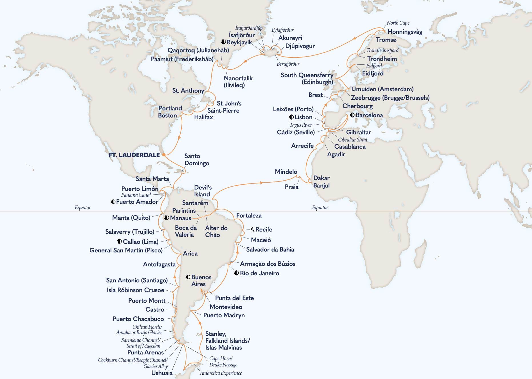This epic adventure circumnavigates the globe (January 25, 2025 - June 7, 2025), departing and arriving in Fort Lauderdale, Florida. Immerse yourself in the rich tapestry of historic landmarks, vibrant capitals, and dramatic natural wonders across Antarctica, South America, Europe, and Canada.
